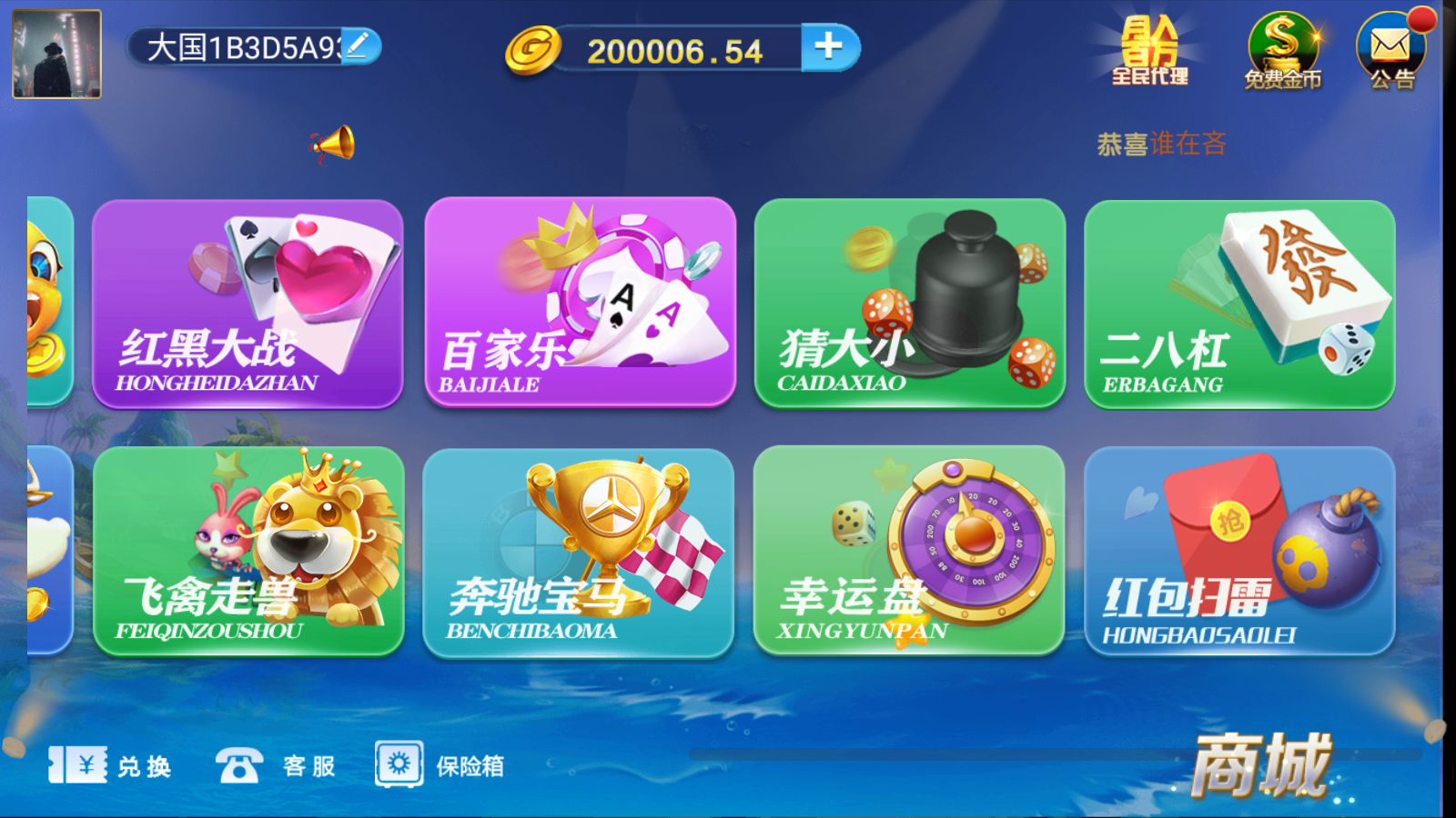 源码描述:炸金花,抢庄牛牛,斗地主,龙虎大战,休闲捕鱼,百人牛牛,红黑大战,飞禽走兽,百家乐,奔驰宝马,猜大小,幸运盘,二八杠,红包扫雷
