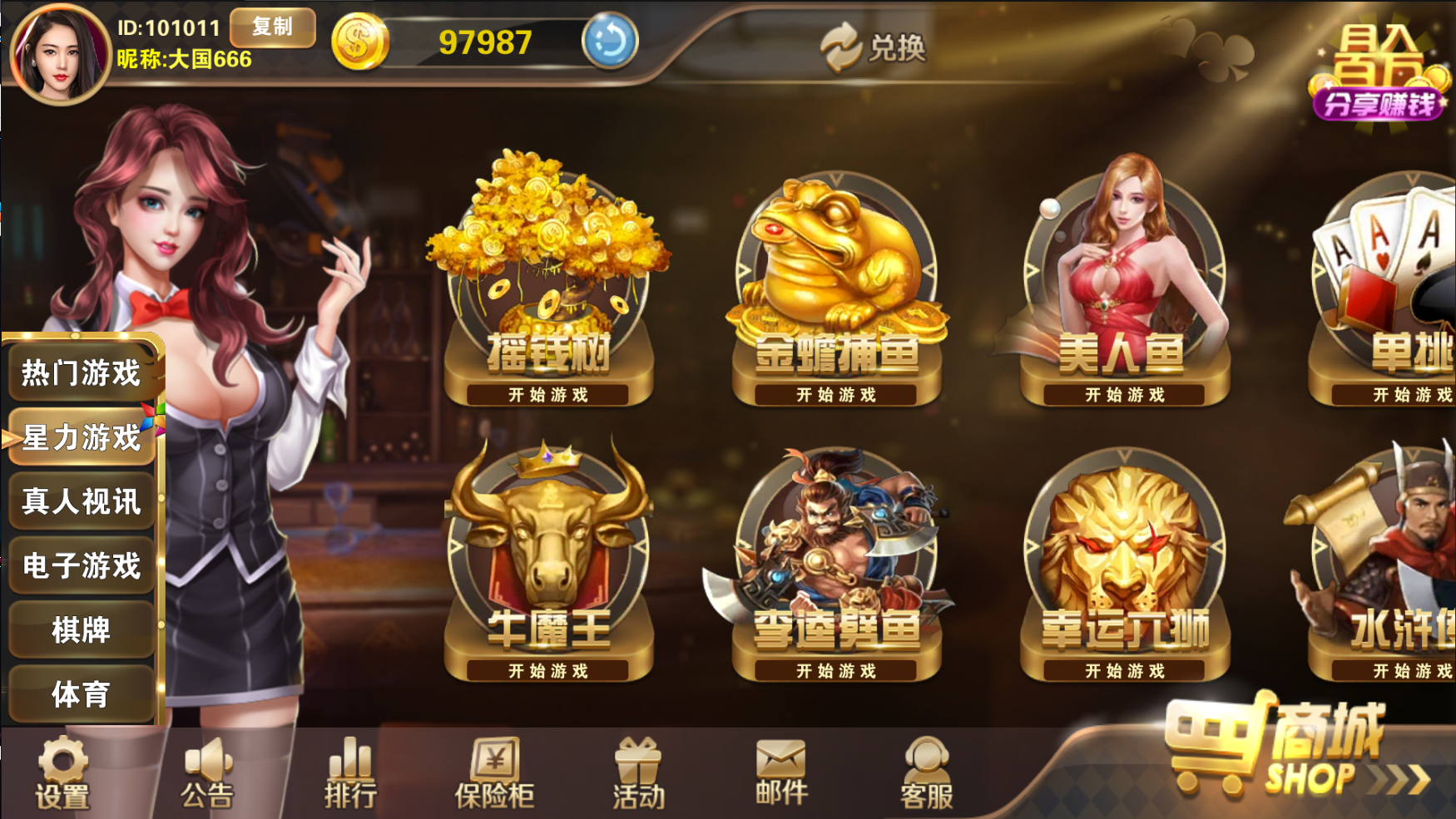 子游戏:摇钱树,金蟾捕鱼,李逵劈鱼,单挑,牛魔王,幸运六狮,单挑(ATT连环炮),奔驰宝马,水浒传,美人鱼。